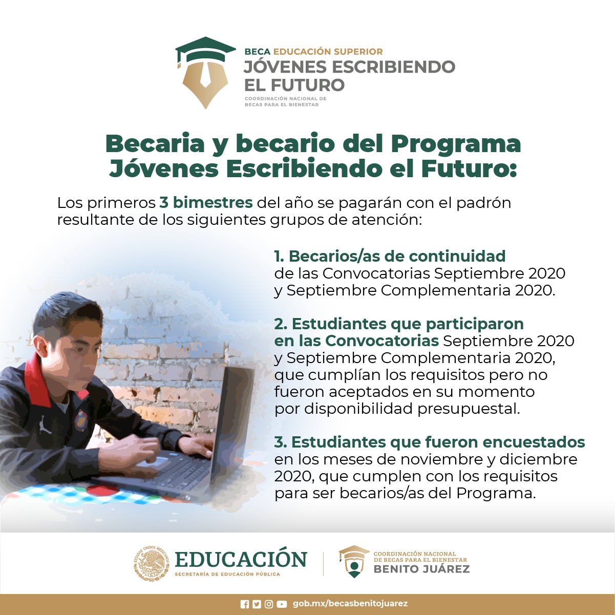 Todo sobre los pagos de Jóvenes Escribiendo el Futuro en el 2021 Si eres un estudiante universitario de hasta 29 años de edad en posición vulnerable y en necesidad de una ayuda extra para finalizar tus estudios la beca Jóvenes Escribiendo el Futuro es para ti. Cuándo depositan jóvenes escribiendo el futuro 2021. Debido al periodo electoral la convocatoria de la Beca Jóvenes Escribiendo el Futuro 2021 no fue publicada en febrero como el año pasado.